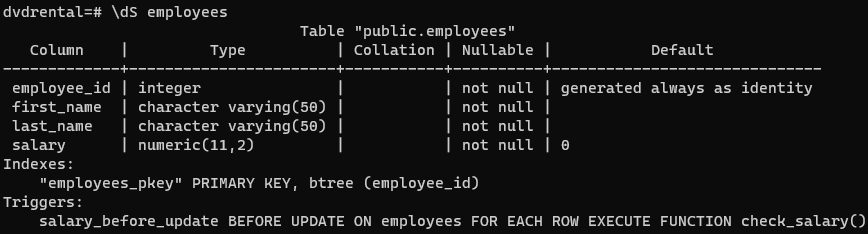 Third, create a before-update trigger that executes the check_salary() function before updating the salary: